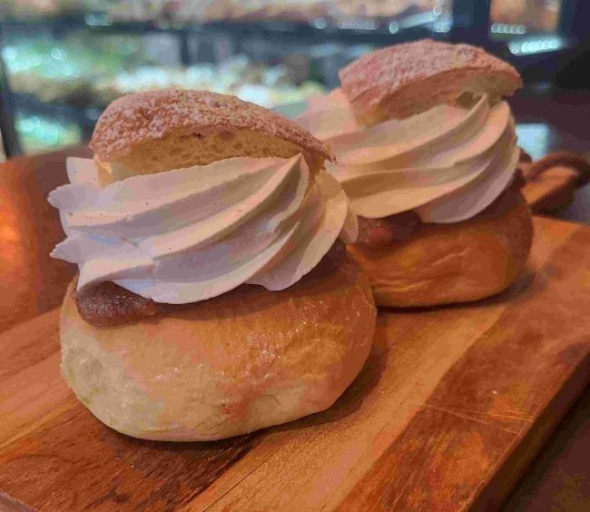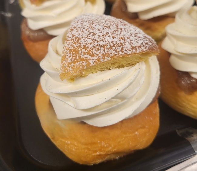 Vår semla är bakad på mjukt och luftigt vetebröd med en fin ton av kardemumma. Den generöst fyllda mandelmassan, gjord på sötmandel och rostade mandlar, ger en rund och nötig smak som möter fluffigt vispad grädde i perfekt balans. Toppad med ett lätt pudrat lock är detta en traditionell semla där varje tugga bjuder på äkta hantverk och klassisk njutning – precis som en semla ska smaka.