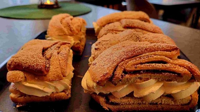 Vår Giffelsemla är en varm och kryddig tolkning av den klassiska semlan. Den mjuka vetebullen är bakad med både kardemumma och kanel, vilket ger en härligt aromatisk smak med tydlig kanelkaraktär. Fylld med generös mandelmassa på sötmandel och rostade mandlar, och toppad med luftigt vispad grädde, bjuder denna semla på en perfekt balans mellan sötma, kryddighet och krämighet. En oemotståndlig fikafavorit för dig som älskar kanel och vill ha något extra.